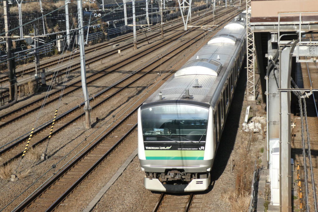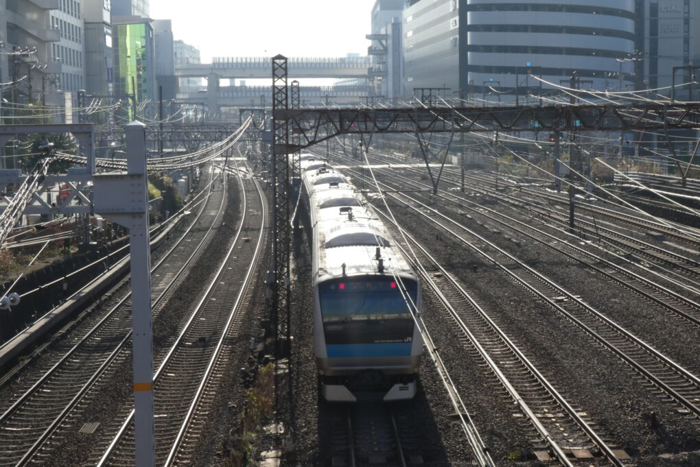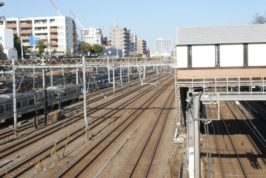 JR(上野東京ライン、湘南新宿ライン、横須賀線、京浜東北線、横浜線)、京急線の6路線が、橋の下を通過していく。