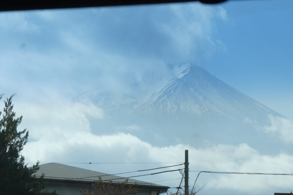 富士山は、富士吉田の町をはるか上空から見下ろしているように見える。