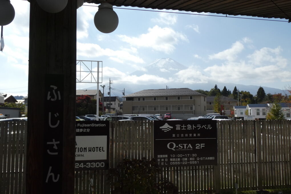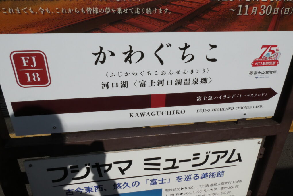 駅名標には、「富士河口湖温泉郷」とあり、温泉地を強調している。
