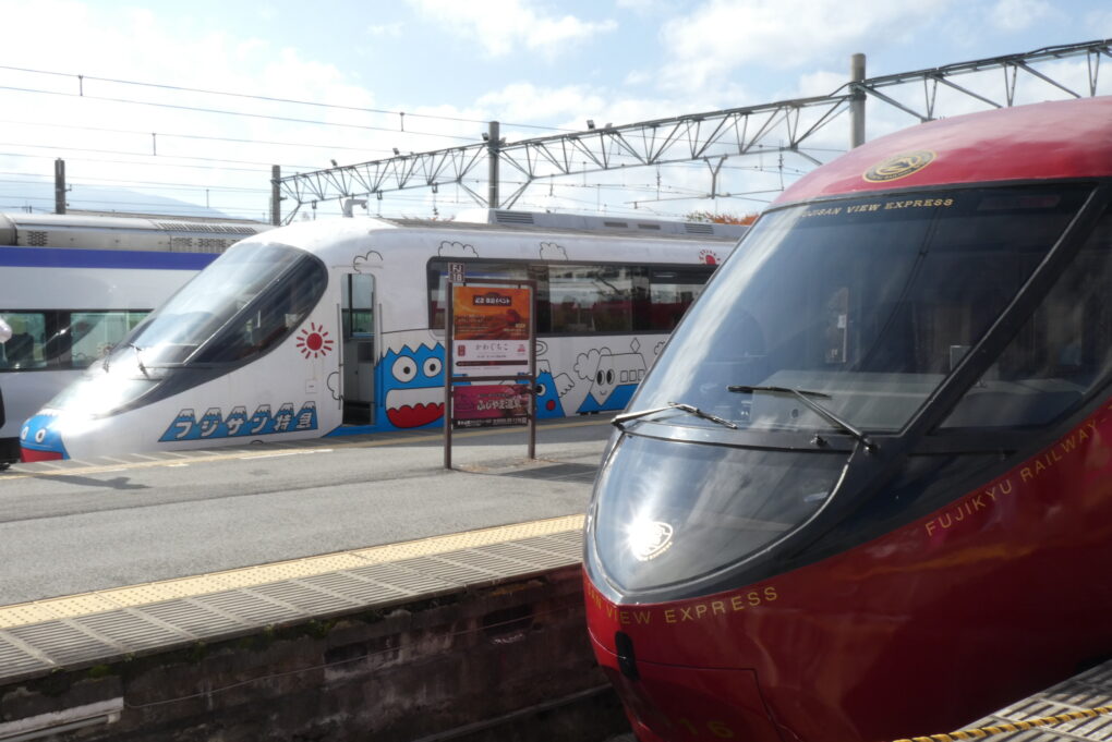 ホームには、フジサン特急と富士山ビュー特急が並ぶ。